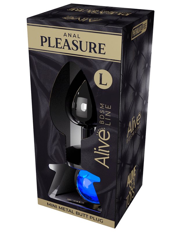 Alive Mini Metal Butt — металлическая анальная пробка длиной 9 см с диаметром 4,1 см и конической формой. Украшена голубым кристаллом, который выполняет функцию безопасного ограничителя.